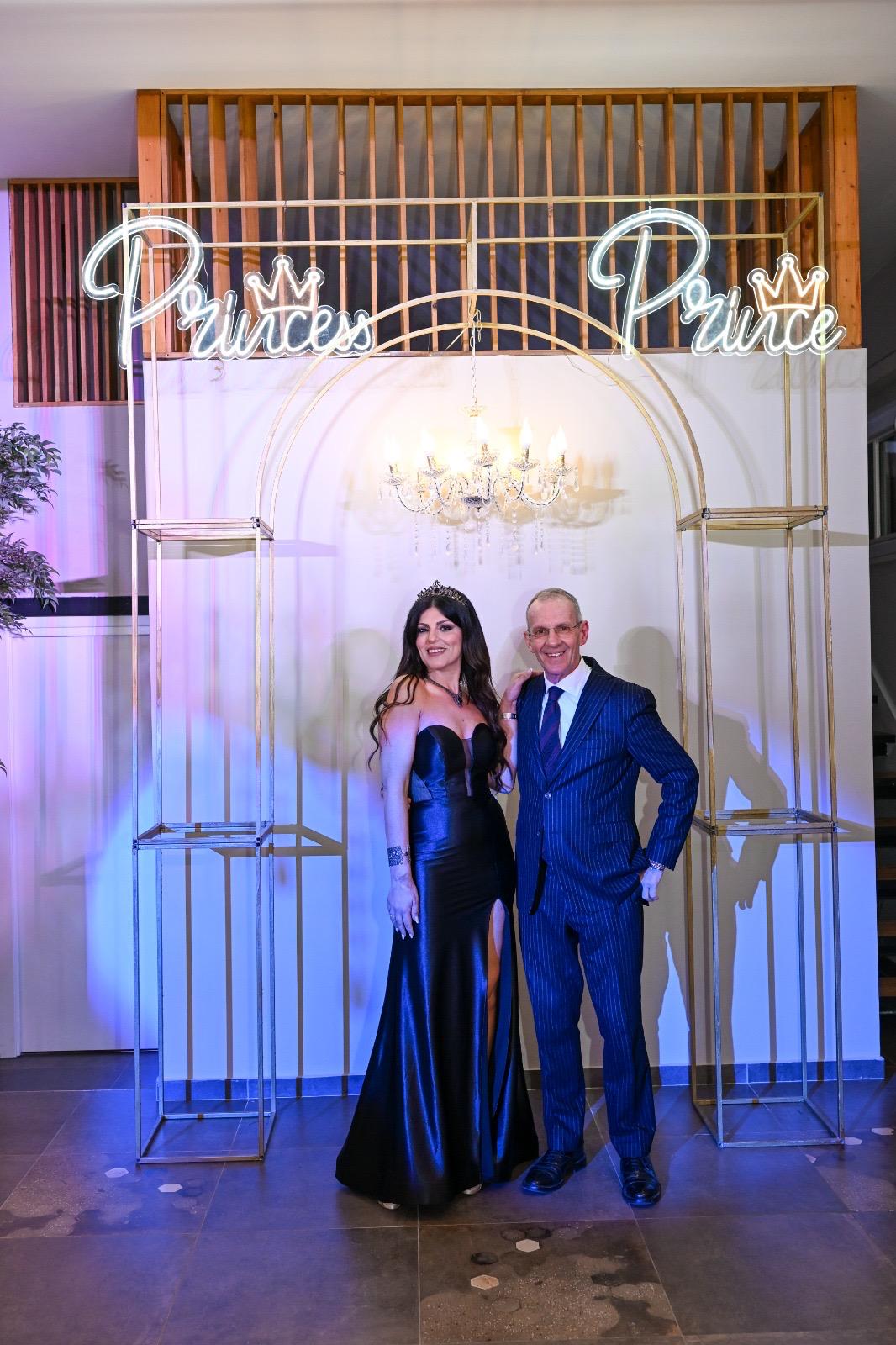 La location si è trasformata in una dimora principesca, con lampadari di cristallo, una struttura foto con scritte “Prince” e “Princess”, un’altalena da favola e una torta tutta in stile oro principesco. È stato un giorno magico!